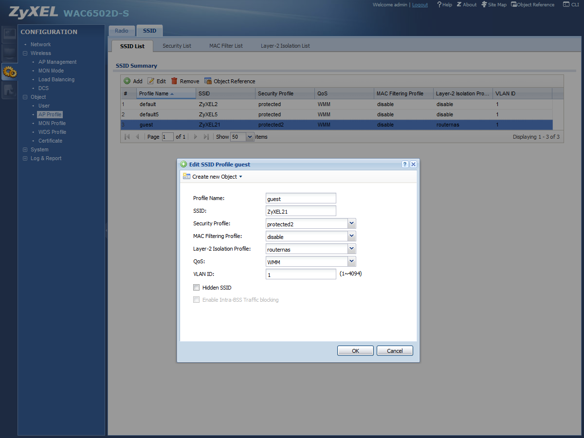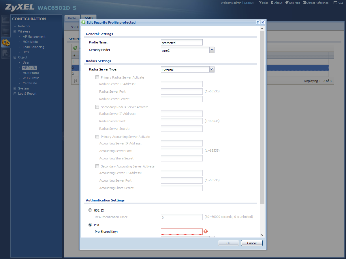 В профиле беспроводной сети записываются ее имя (SSID), профили безопасности, MAC-фильтра клиентов, изоляции Level 2, режим QoS и другие, включая опцию блокировки трафика между клиентами. Устройство поддерживает работу с открытыми сетями, а также с защитой WEP, WPA/WPA2. В последнем случае может использоваться парольная фраза или внешний сервер RADIUS.