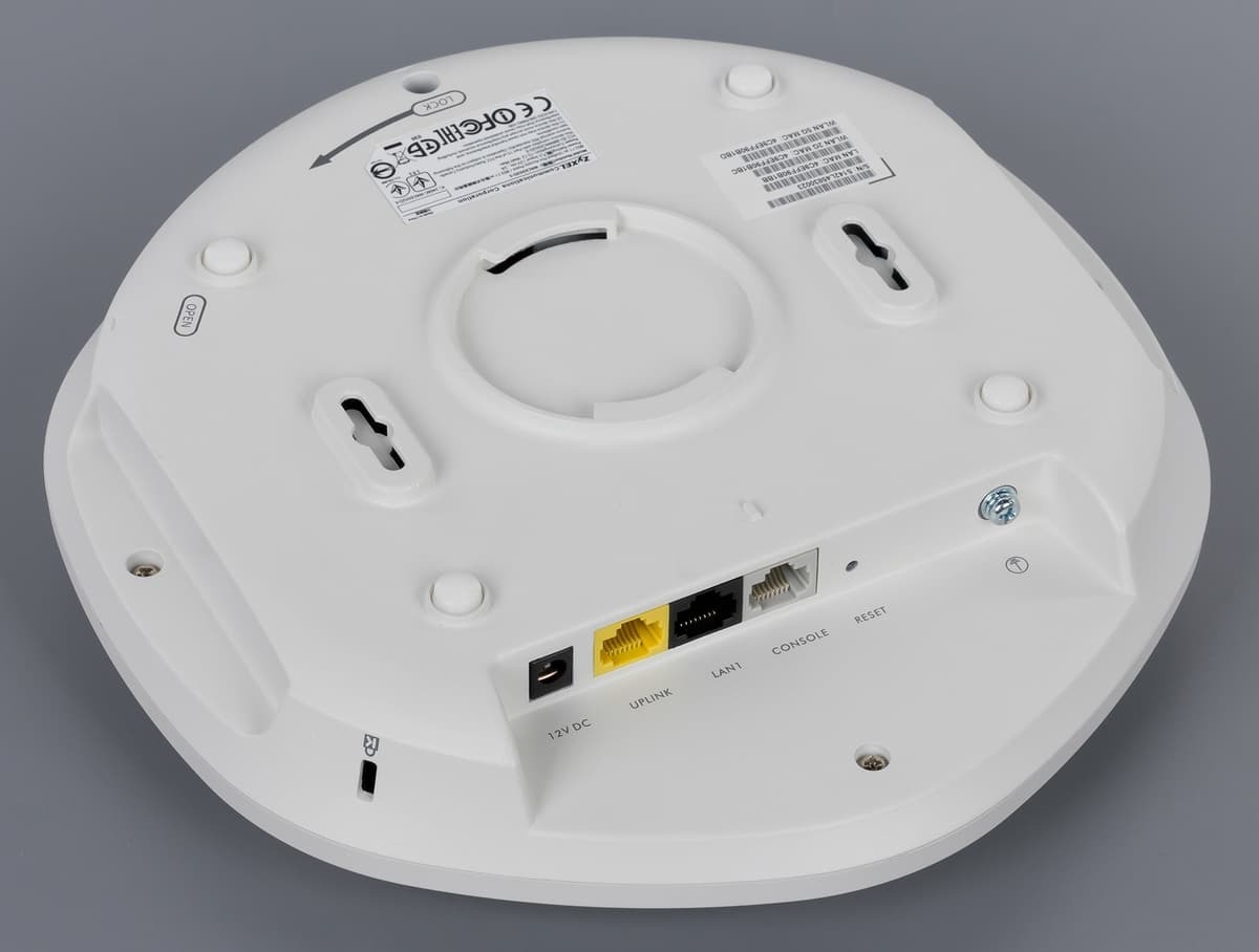 Точка доступа имеет новую для решений Zyxel конструкцию, которая, впрочем, часто встречается у других производителей. Достаточно крупный корпус модели имеет форму шестиугольника со скругленными краями. Габаритные размеры составляют 240 мм в диаметре и 63 мм в высоту. Нижняя часть корпуса изготовлена из металла, а верхняя крышка — из специального негорючего пластика. Производителем был выбран светло-серый цвет и матовая поверхность. Данная модель предназначена для установки внутри помещений и не имеет дополнительной защиты.