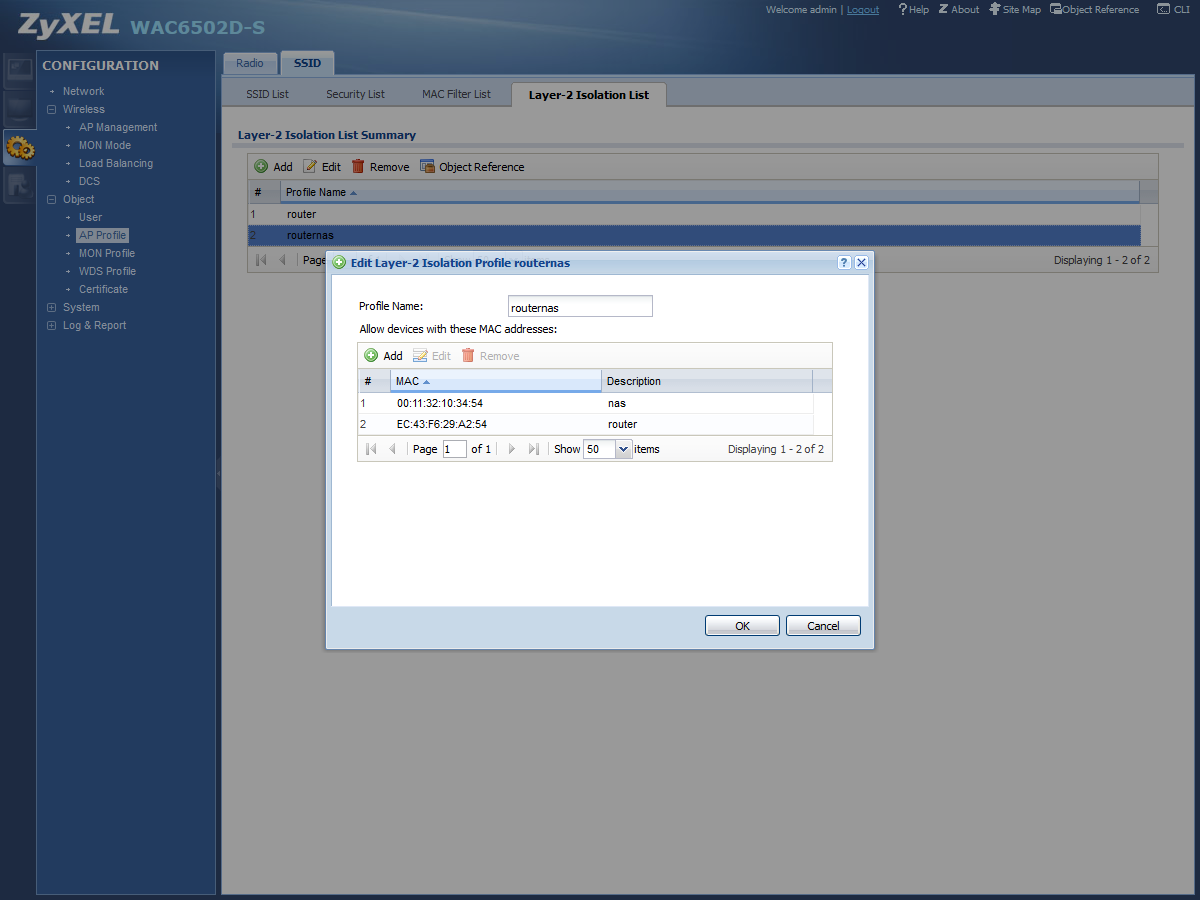 В качестве дополнительного варианта ограничения клиентов можно использовать назначение для профиля SSID изоляции Layer-2. В список вносятся MAC-адреса устройств проводного сегмента сети, к которым будут иметь доступ беспроводные клиенты этого SSID. Таким образом, можно реализовать, например, работу гостевой сети, где в список вносится только адрес роутера. Дополнительно этим пользователям можно разрешить печатать документы на сетевом принтере или иметь доступ к локальному веб-серверу, добавив в список соответствующие MAC-адреса.