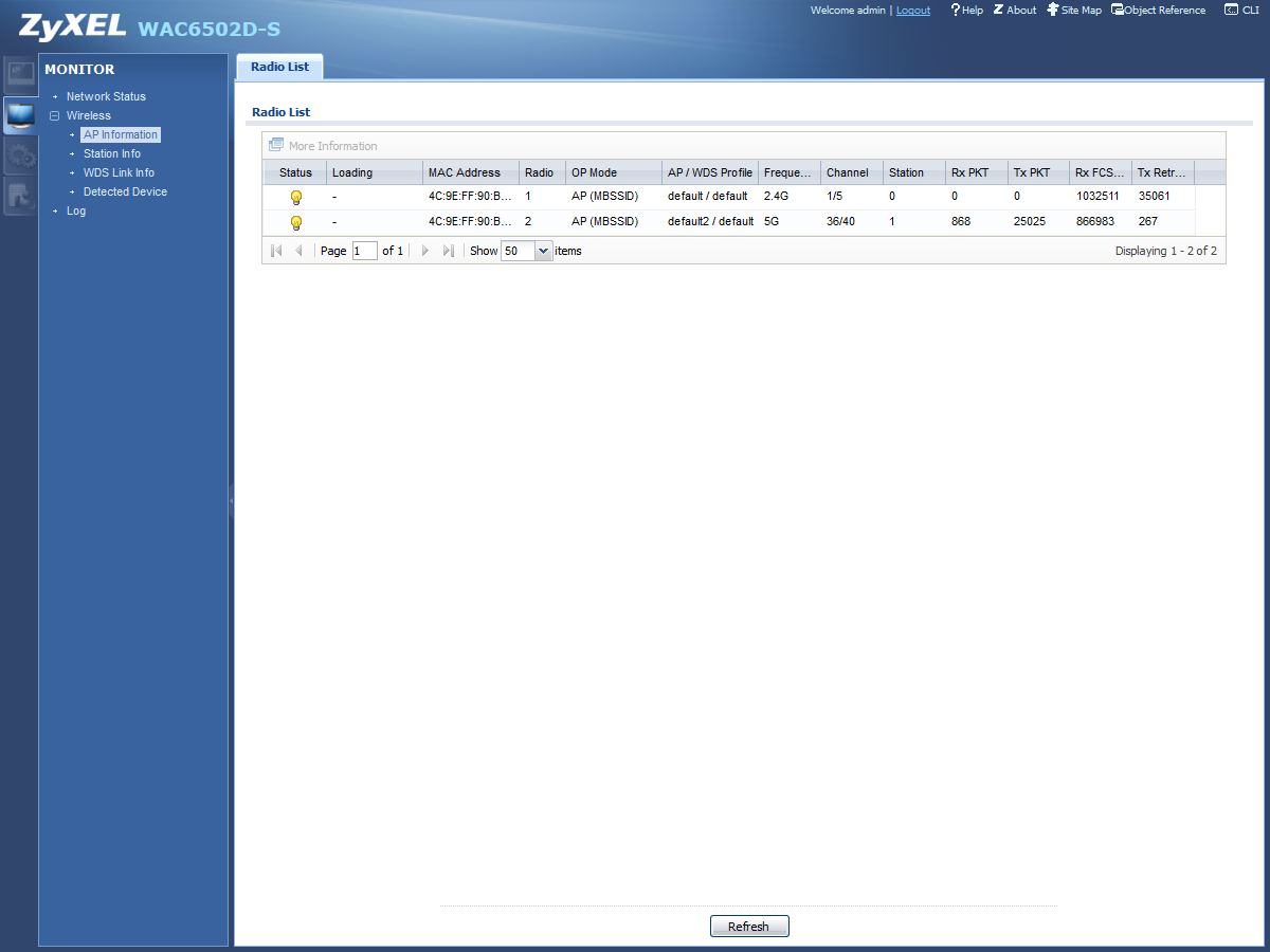 Для радиоконтроллеров приводится информация об их профилях, используемых каналах, числе подключенных клиентов, объемах трафика. Есть таблица и с подключенными устройствами, где приводятся данные в том числе и по скорости обмена с ними и уровне сигнала.