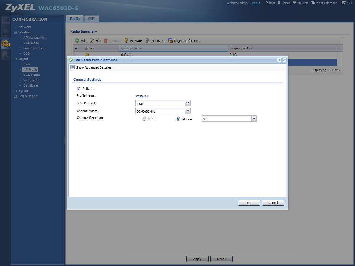 В профиле радио указываются такие параметры, как стандарт, ширина канала, номер канала (для диапазона 5 ГГц поддерживаются 36—64 и 100—140) и некоторые дополнительные опции, в частности скорость трансляций мультикаст. Заметим, что предусмотрено использование технологии динамического выбора номера канала на основании информации о наличии в эфире соседних сетей.