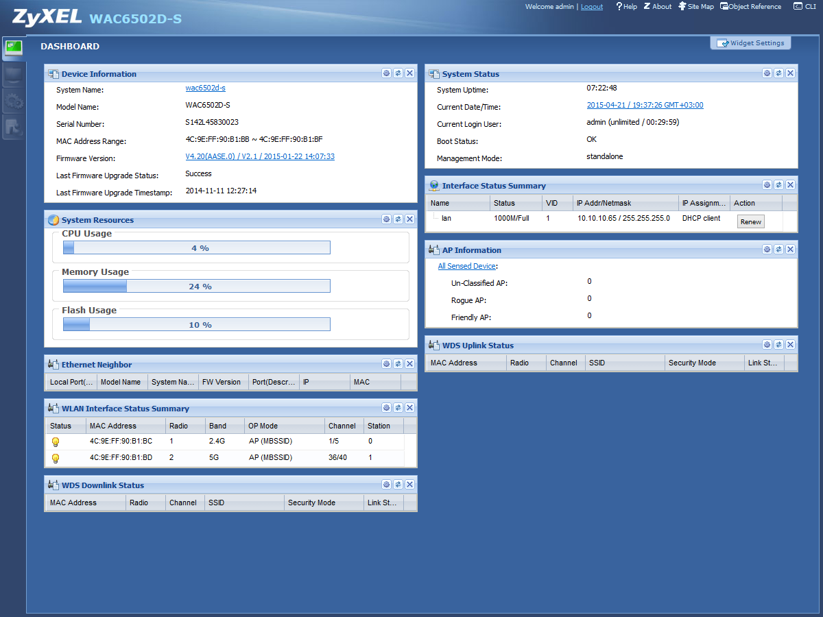 В автономном режиме работы для настройки устройства используется традиционный веб-интерфейс. Он защищен паролем, имеет возможность изменения номера порта, поддерживает https (в том числе и с пользовательским сертификатом). Кроме того, в системе предусмотрена работа с протоколами ssh, telnet, ftp и snmp, что вполне характерно для оборудования корпоративного уровня. Интерфейс представлен только на английском языке и имеет ссылку на он-лайн справку.