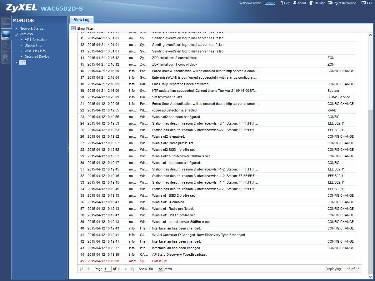 Системный журнал точки доступа достаточно подробный и может быть отсортирован по типу сообщений, а для удобства поиска и анализа информации есть возможность установки фильтров по разным полям.