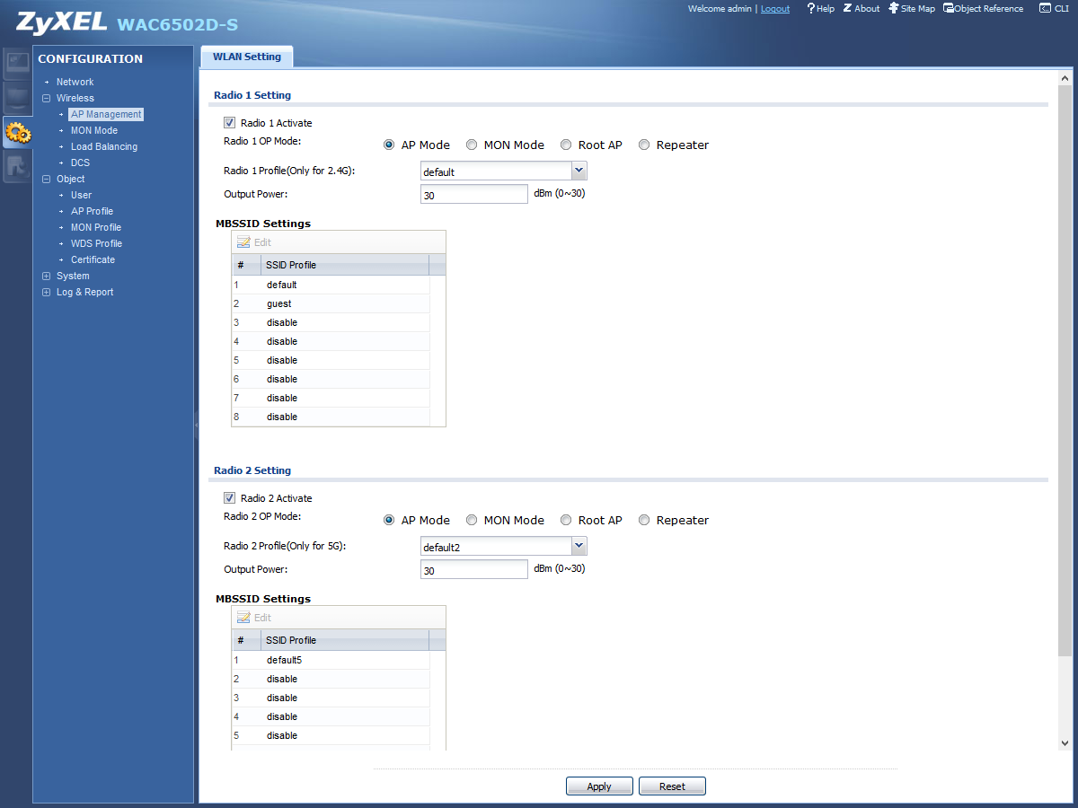 Использование профилей позволяет в разных местах программировать отдельные параметры системы и потом использовать совместно. Например, при создании беспроводной сети вы указываете ее имя, профиль защиты, профиль фильтра MAC-адресов и некоторые другие параметры. Потом на соответствующей странице назначаете этот профиль радиомодулю. Некоторую неразбериху вносит постоянное использование имени «default» для профилей разных типов, а также невозможность удалить или переименовать эти записи. Кроме того, не всегда выбранное разделение опций по группам кажется логичным (например, номер канала указывается в профилях радио, а уровень выходного сигнала — при назначении профиля точке доступа). Так что для максимально эффективного использования продукта придется потратить время на изучение всех особенностей конфигурации.