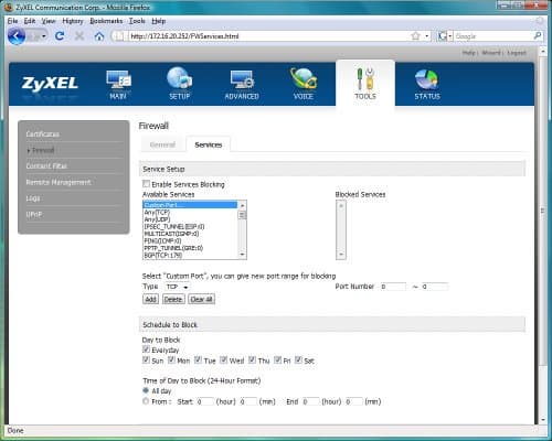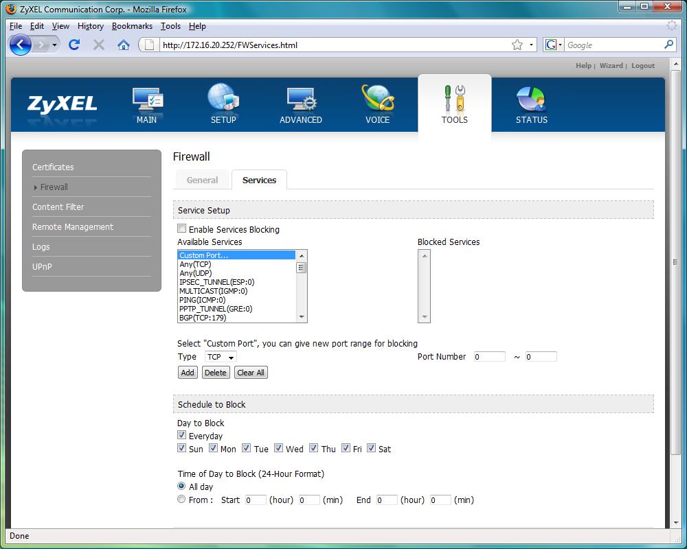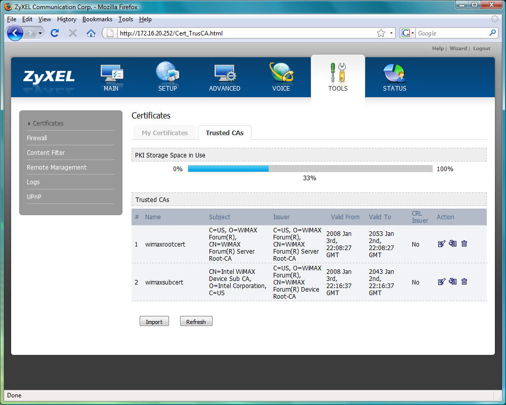 Пятая страница названа несколько неожиданно — «Tools». Но никаких «инструментов» (например ping) здесь нет. Скорее ее наполнение можно было бы назвать «Advanced». В частности можно увидеть списки сертификатов (большинство из них требуется для регистрации устройства в сети WiMAX), настройки встроенного межсетевого экрана и фильтра контента. Для больших сетей могут пригодиться возможности удаленного управления устройством — можно разрешить доступ со стороны WAN к Web-интерфейсу или по протоколам FTP, telnet и TR-069.