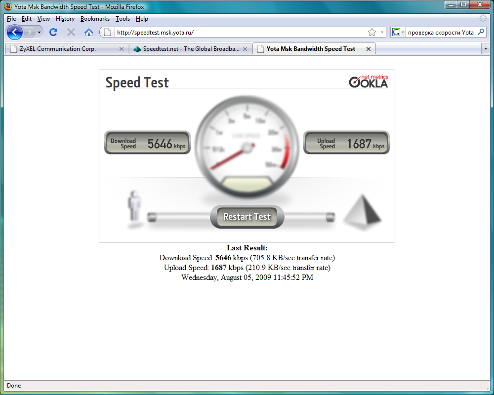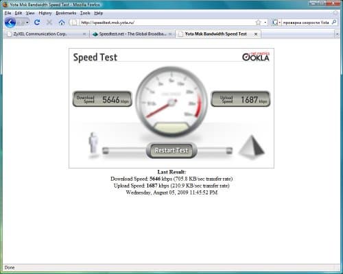 Проводить серьезное исследование скорости работы беспроводного оборудования достаточно сложно — ситуация в эфире меняется слишком часто, что-бы можно было делать объективные выводы. В целом при высоком уровне сигнала производительность работы WiMAX была не хуже чем у USB-модема Samsung SWC-U200, а использование роутера внутри помещений явно показало его преимущество в чувствительности. Во время тестов в домашней обстановке роутер был установлен на подоконнике. Это позволило получить скорости порядка 6 Мбит/с и 2 Мбит/с на прием и передачу соответственно. Смог справиться роутер и с высокой нагрузкой в виде пары активно работающих торрент-клиентов (хотя в Yota сейчас обычно выдает «серые» (немаршрутизируемые) адреса, что несколько снижает возможности подобных программ).