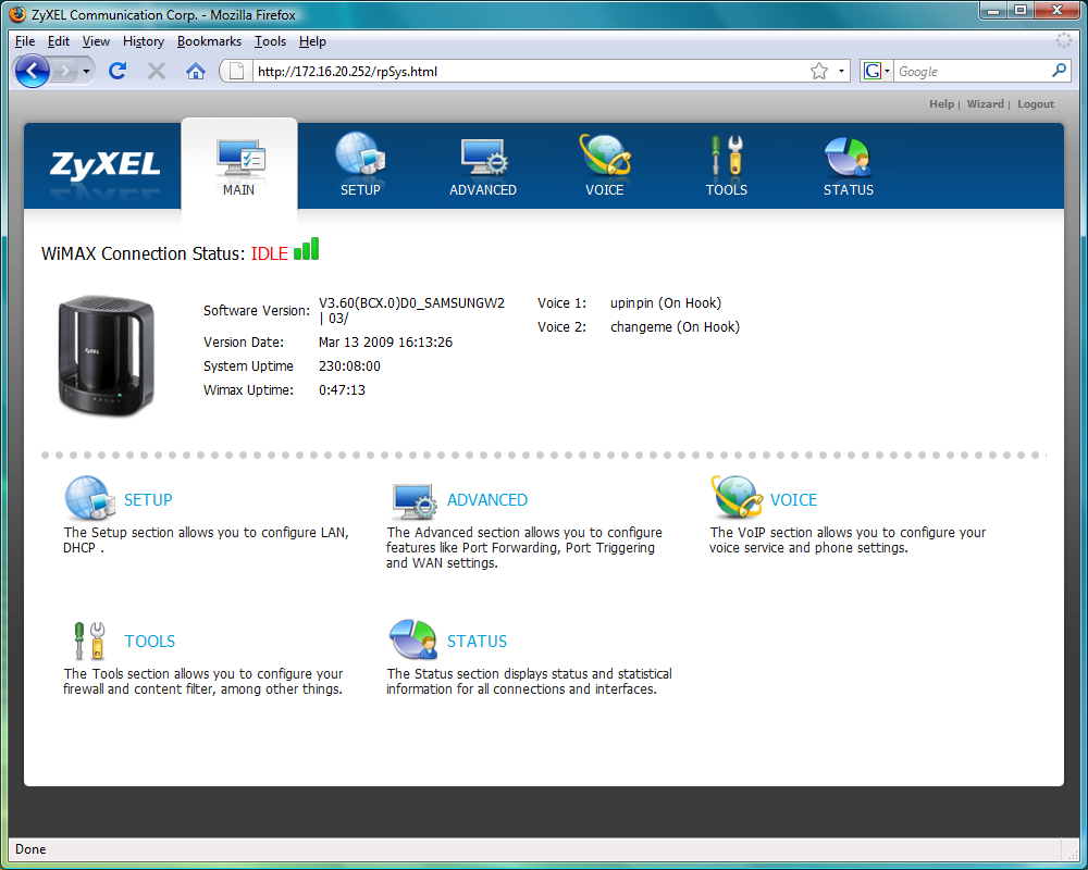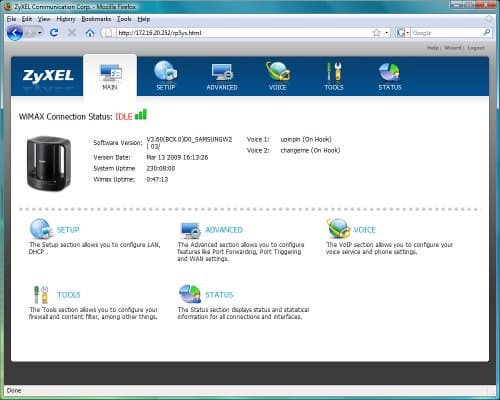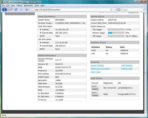 На первой странице («Main») можно ознакомиться с основными параметрами роутера — версия прошивки, время работы, время активности WiMAX-линка, имена и состояние учетных записей SIP. Также есть ссылки на остальные пункты меню с краткими пояснениями их функционала. Отметим, что русской версии интерфейса в настоящий момент нет и мы рассматриваем английский вариант.
