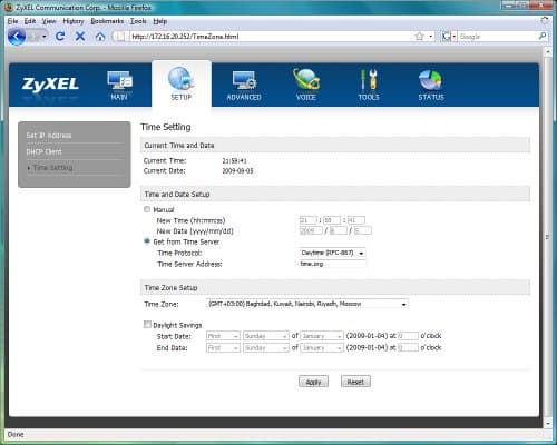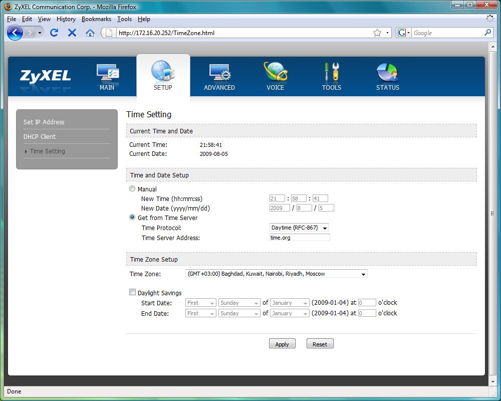 Вторая страница («Setup») используется для настройки IP-адреса устройства, просмотра списка DHCP-клиентов и установки встроенных часов (конечно есть синхронизация через Интернет).