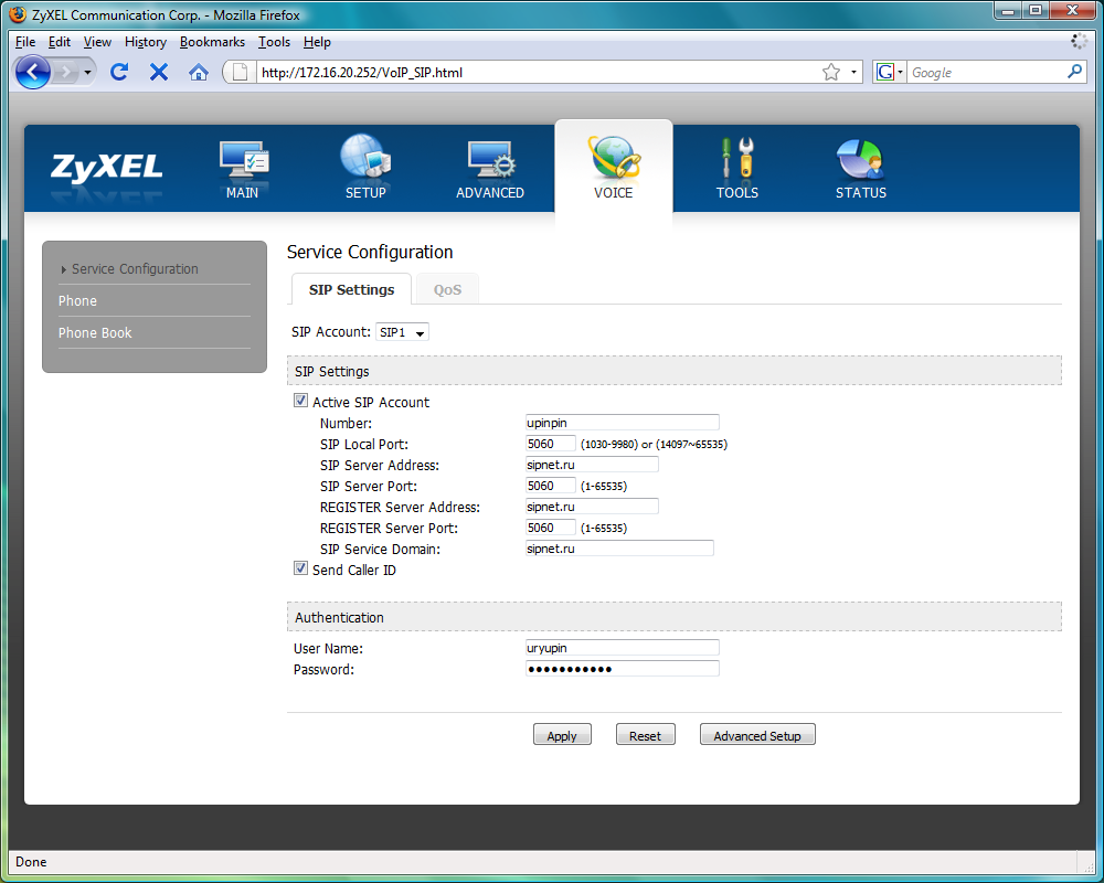 Однако для начальной настройки потребуется использовать устройство с Web-браузером. По-умолчанию роутер имеет запрограммированный сетевой адрес 192.168.1.1 и активированный сервер DHCP, так что клиенты автоматически получат свои сетевые адреса. В большинстве случаев устройство готово к работе «из коробки», однако при необходимости можно через Web-интерфейс запрограммировать дополнительные параметры, например аккаунты VoIP.