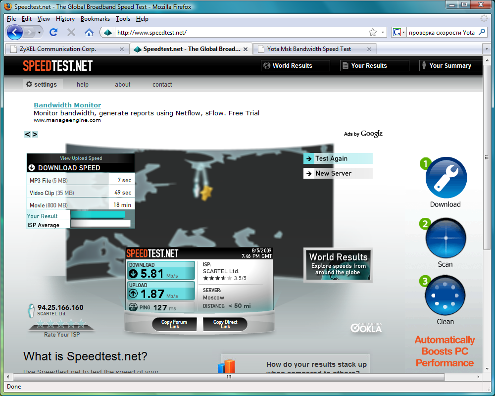 Не было проблем и с работой телефонных аппаратов через провайдера SIPNET. Даже при сильно используемом для загрузки данных канале звук был чистый, а связь устойчивая. Skype также успешно работал по WiMAX, в том числе и с видеотрансляцией.