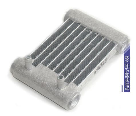 Этот радиатор построен по традиционной «батарейной» схеме, часто встречающейся в автомобильных теплотехнических устройствах: каркас конструкции составляют две коллекторные «бочки» 94х22 мм и девять плоских трубок 100х13х1,5 мм (своеобразные колена радиатора), между которыми проброшены «гармошки» из чрезвычайно тонкой (толщиной всего около 0,05 мм) «перфорированной» алюминиевой ленты. Весь «агрегат» выполнен предельно аккуратно и с хорошим качеством пайки.