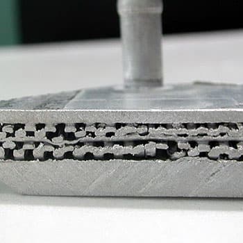 Однако его внутренняя конфигурация кардинально изменяет первое, не слишком благоприятное впечатление. В отличие от типических многоходовых конструкций (с характерным «лабиринтом» внутренних каналов) здесь мы имеем совершенно иную картину: более 400 тонких прямоугольных стержней сечением около 0,5 мм многослойно «раскинуты» в полости теплообменника параллельно его подошве и аккуратно запаяны на внутренней поверхности торцов.