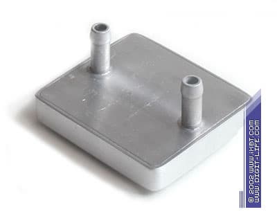 Пожалуй, самым главным элементом любой системы водяного охлаждения является теплообменник, именно от его технических качеств (термического и гидравлического сопротивления) во многом зависит общая тепловая эффективность системы. Внешне теплообменник, используемый в Poseidon WCL-02, не вызывает бурю оваций: паяный алюминиевый корпус 72х62х12 мм, выполненный из холоднопрессованных заготовок, и незатейливые штуцеры стандартного полудюймового диаметра, запаянные «на крышку», представляют собой простое и строгое решение без особых технологических изысков.