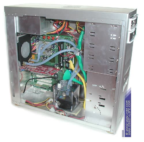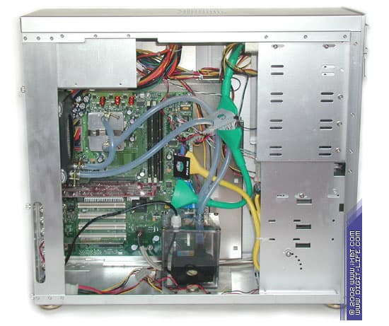 Основная задача определиться с расположением резервуара и радиатора (место теплообменника, понятное дело, ограничено областью процессора). Замечу нет никаких принципиальных трудностей для того, чтобы разместить и резервуар, и радиатор вне компьютерного корпуса в любом технически разумном и удобном месте (т.е. экстремалы cмогут воспользоваться системой даже в корпусах типа MicroATX), но это будет крайне не эстетично, поэтому такой вариант сразу отметается большинством пользователей (хотя, в плане тепловой эффективности именно такое расположение является наиболее оптимальным). При размещении системы в большом просторном корпусе с «горизонтальным» БП, снабженном вентиляторами в передней и задней стенке свобода выбора также сильно не ограничивается. Радиатор можно зафиксировать на переднем, либо на заднем вентиляторе (в радиаторном кожухе очень предусмотрительно проделано более десятка крепежных отверстий, что позволяет устанавливать радиатор как вертикально, так и горизонтально, относительно свободно варьируя его местоположение на прикручиваемом вентиляторе). А резервуар можно поставить на дно корпуса или даже «загнать» в отсек устройств формата 5.25", если провернуть эту «авантюру» позволят его размеры. Тут, как говорится, поле открыто для экспериментов, но главное не переусердствовать ;-)