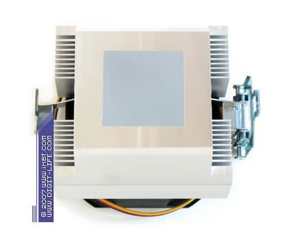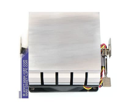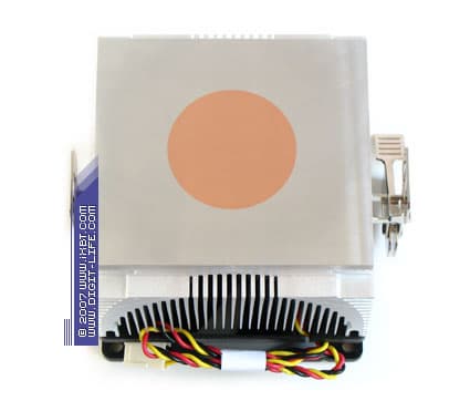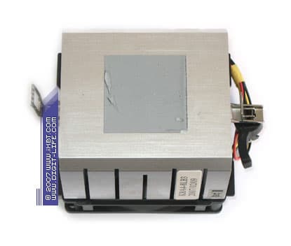 «Новичок» DC-K8J825Z/N/G в конструктивном плане повторяет лейтмотив знакомого нам бюджетника Foxconn NBT-CMAM23B-C — он оборудован алюминиевым радиатором 77×77×38 мм (подошва 77×37 мм) практически такой претенциозной конфигурации, основу которой составляет оребренная U-образная несущая. Только теперь набортный вентилятор другой — «инвертированного» типа (подшипник скольжения, номинальная скорость вращения крыльчатки 2200 об/мин), да и параметры оребрения слегка изменены (ребро трапецеидального сечения толщиной 0,7 мм в основании, и 0,3 мм — у вершины, средний шаг размещения 2 мм, общая площадь поверхности теплообмена порядка 800 см²).
