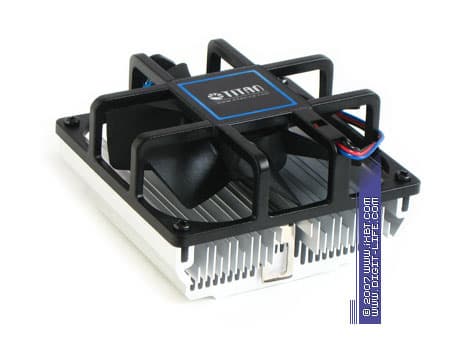 Другой бюджетник Titan DC-K8H925Z/N, выглядит более оптимистично он базируется на низкопрофильном алюминиевом радиаторе 88×89×32 мм (подошва 77×45 мм), оборудован «инвертированным» вентилятором типоразмера 92×92×25 мм (подшипник скольжения, номинальная скорость вращения 2200 об/мин) и оснащен безотверточным крепежом.