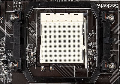 А у самого сокета слегка изменилась схема крепления процессора — пропали ограничители по бокам, не дававшие радиатору сместиться в сторону (вправо или влево), и зацепы для крепления кулера сократили с трёх до одного (на каждую сторону). Таким образом, за исключением того, что зацепы расположены не на сокете, а на специальной «обвязке», крепимой к плате винтами, новое крепление больше всего напоминает… Socket A или Socket 370. Неизвестно, какая идея вдохновила инженеров AMD на этот «Back to the future». Впрочем, кулеры для Socket 754/939/940 на новый сокет хоть и с некоторым скрипом, но устанавливаются, и работают вполне нормально. Также впервые на плате для платформы AMD мы увидели разъём для подключения 4-пинового PWM-кулера. Видимо, AMD решила в новой платформе «догнать Intel по всем пунктам» :).