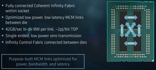 Шина для передачи данных между блоками CPU или между различными кристаллами под названием Infinity Fabric уже известна нам по предыдущим решениям компании, включая настольные процессоры Ryzen. Главным преимуществом этой шины является универсальность, так как она объединяет не только блоки внутри ядра, но и между ними, и даже между сокетами.
