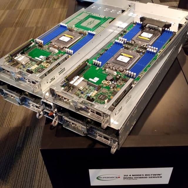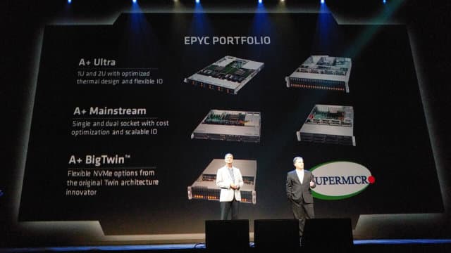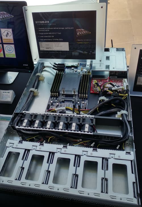 Нельзя не отметить активность компании Supermicro, которая показала на мероприятии несколько моделей серверов на базе Epyc, которые серьезно отличаются друг от друга и предназначены для различных рыночных сегментов:
