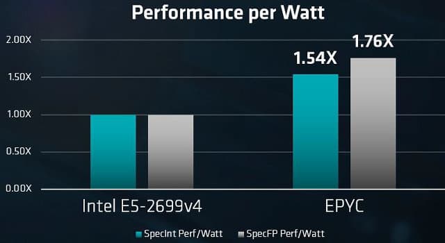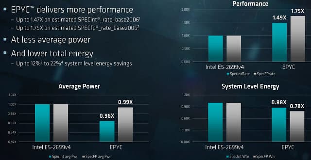 Сравнения, предоставленные компанией AMD, говорят о том, что серия процессоров Epyc 7000 имеет лучшее соотношение производительности и потребления. Системы на основе новых процессоров AMD потребляют меньше энергии, по сравнению с аналогичными серверами на основе процессоров Intel Xeon E5 v4 (текущее поколение Broadwell) — экономия энергии составляет порядка 12%-22%.
