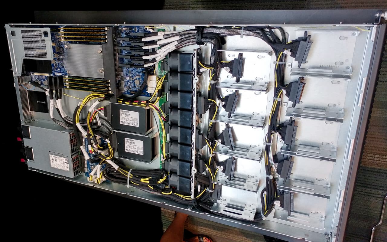 Для примера можно взять 2U-сервер из четырех систем, в каждую из которых можно поставить по два 32-ядерных процессора Epyc (или по одному, в зависимости от потребностей клиента):