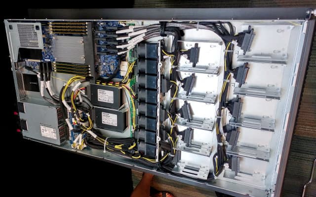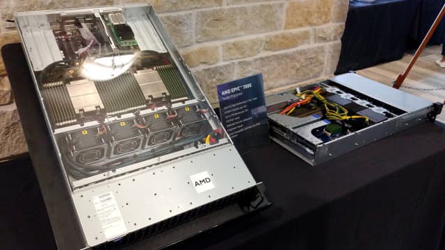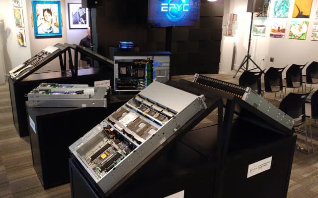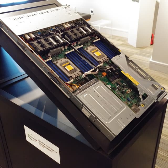В мероприятии по запуску процессоров Epyc участвовало большое количество компаний-партнеров AMD. Многие из них тут же предлагали посмотреть на готовые серверы или компоненты, среди которых были как однопроцессорные, так и двухпроцессорные системные платы, так и готовые решения, в том числе двухпроцессорные серверы с 32 разъемами для памяти, заполненными модулями DDR4 — такое решение даст большой общий объем памяти и высокую пропускную способность.
