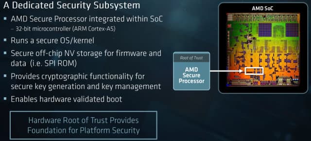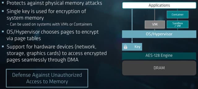 Самая важная функция современного процессора безопасности AMD — новая технология Secure Memory Encryption (SME), которая разработана для защиты памяти от несанкционированного доступа. Это полностью аппаратное шифрование данных в памяти, которое позволяет хранить все данные в памяти в зашифрованном виде, чтобы противостоять атакам злоумышленников. Именно из-за применения выделенного сопроцессора, включение шифрования памяти сказывается на производительности незначительно.
