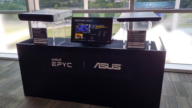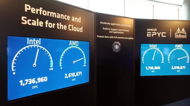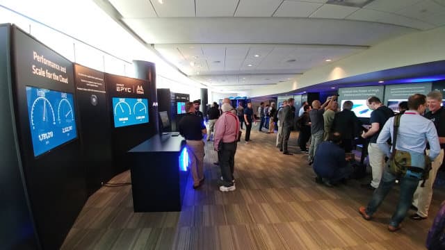 Естественно, сделано это было скорее в режиме шоу, но как еще можно оценить преимущество серверных систем? К слову, серверные стойки со всеми демо-стендами на основе Epyc и Xeon тихо стояли в сторонке — так что все показанное в демонстрационных стендах железо и ПО работало по-настоящему, в реальности.