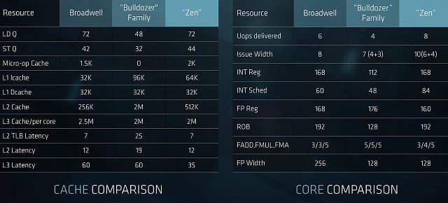 Если сравнивать микроархитектуру Zen с другими, то в новой заметно улучшили задержки во всем чипе, включая задержки кэш-памяти, которые значительно снизились. По данным компании AMD, задержки в Zen, связанные с кэш-памятью второго и третьего уровней сравнимы или даже чуть лучше задержек архитектуры Intel Broadwell и обе они, конечно же, значительно опережают предыдущее поколение микроархитектуры Bulldozer.
