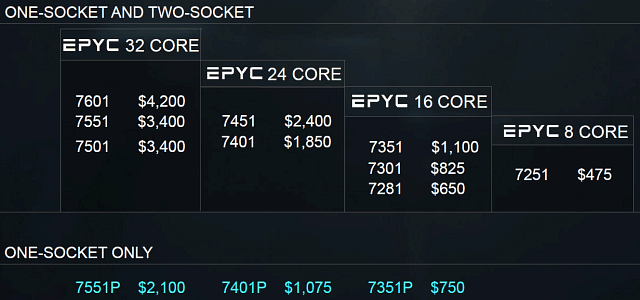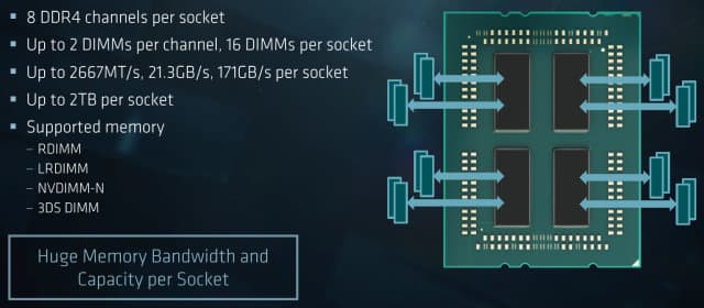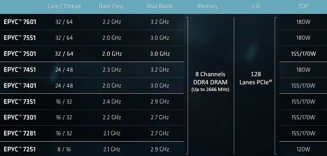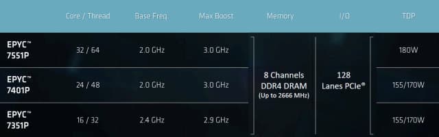 В отличие от многочисленных серверных моделей CPU у Intel, компания AMD представила лишь несколько моделей, которые отличаются друг от друга по числу вычислительных ядер, частотам и энергопотреблению. Серия серверных процессоров Epyc 7000 имеет основу в виде единого набора функциональности для всех решений, включая поддержку восьми каналов DDR4-памяти на каждый разъем объемом до 2 ТБ памяти, также на каждый сокет.