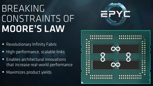 При создании серверных процессоров Epyc используются те же кристаллы, собранные на одной упаковке по четыре. Такой многокристальный подход позволяет минимизировать расходы за счет унификации всех кристаллов, предназначенных для разных рынков. Кроме этого, подобное решение позволяет обойтись сравнительно несложными кристаллами площадью менее 200 мм², в отличие от крупных кристаллов у конкурента, имеющего преимущества в виде собственного передового микроэлектронного производства.