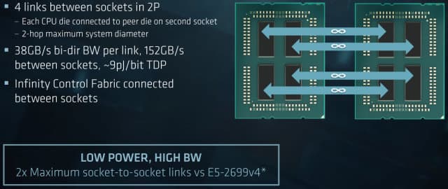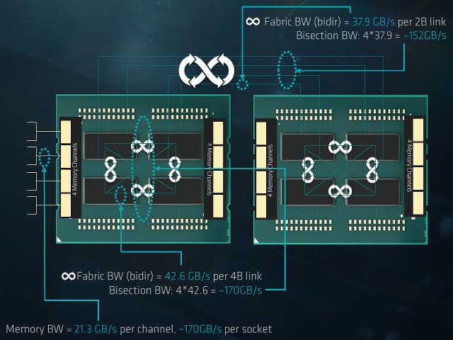 Все ядра каждого из пары процессоров Epyc 7000 в двухпроцессорной системе связаны друг с другом при помощи Infinity Fabric. Соединения между ядрами полностью когерентны в пределах сокета и оптимизированы для низких задержек и малого энергопотребления. Пропускная способность каждой из двунаправленных связей между ядрами на кристалле равна 42 ГБ/с, что в общем составляет 170 ГБ/с. Двунаправленные каналы между сокетами обеспечивают пропускную способность до 38 ГБ/с и в общем до 152 ГБ/с.