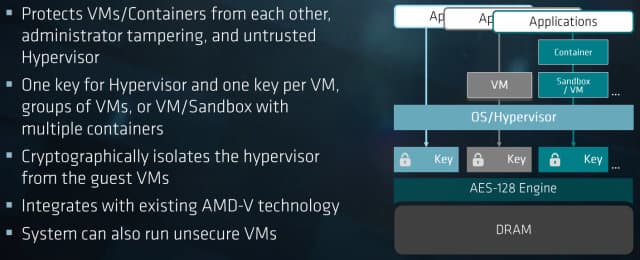 Шифрование данных в памяти особенно важно для задач виртуализации, ведь каждая виртуальная машина может защищать данные от других виртуальных машин — эта возможность может открыть сферы применения виртуализации в задачах, сверхтребовательных к вопросам безопасности. Все это позволяет сделать технология SEV (Secure Encrypted Virtualization) — виртуализация изолированных виртуальных машин.