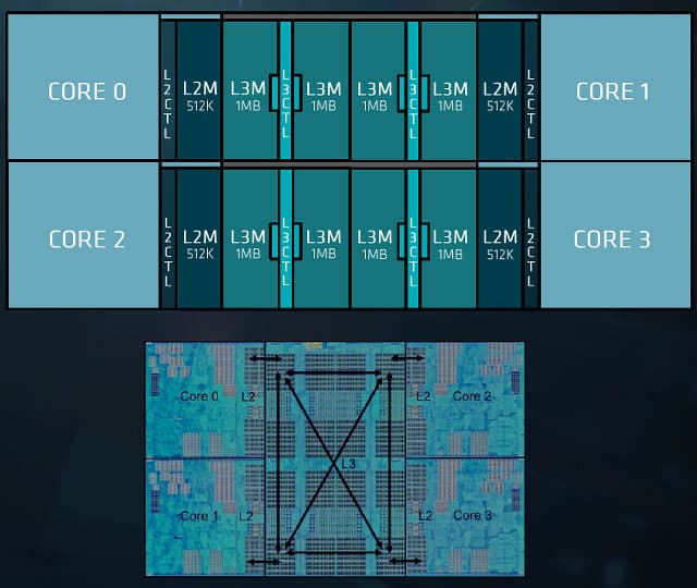 Модуль CCX содержит до четырех ядер с выделенной для них кэш-памятью первого и второго уровней (512 КБ на ядро) и общим кэшем третьего уровня (8 МБ). Два CCX-модуля при помощи шины Infinity Fabric и имеют общий контроллер памяти и общий PCI Express хаб. Восьмиядерный кристалл, составленный из двух CCX-модулей, используется во всех процессорах Ryzen и Epyc, он может выполнять 16 потоков и имеет 4 МБ L2-кэша и 16 МБ L3-кэша.
