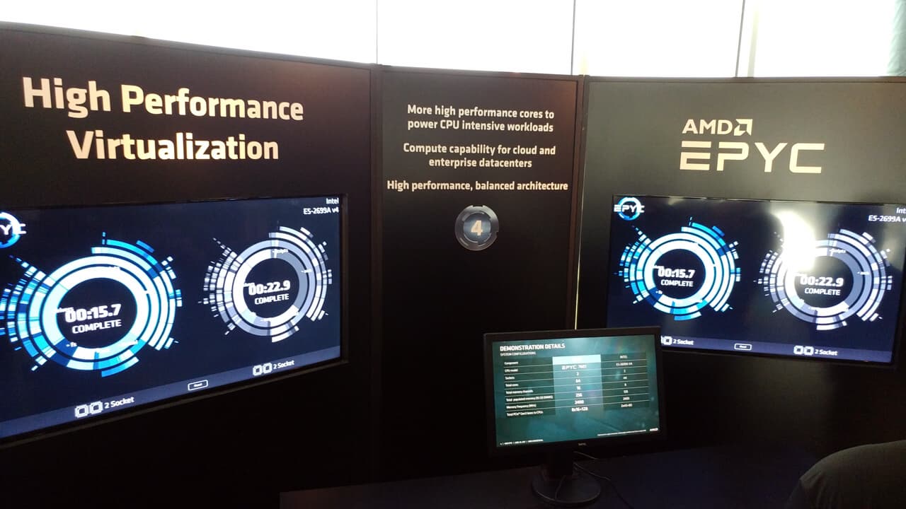 Кроме представленных выше слайдов, на мероприятии, посвященном запуску Epyc, специалисты компании AMD также показали несколько демонстрационных стендов с реальными приложениями, в которых можно ощутить преимущество Epyc.