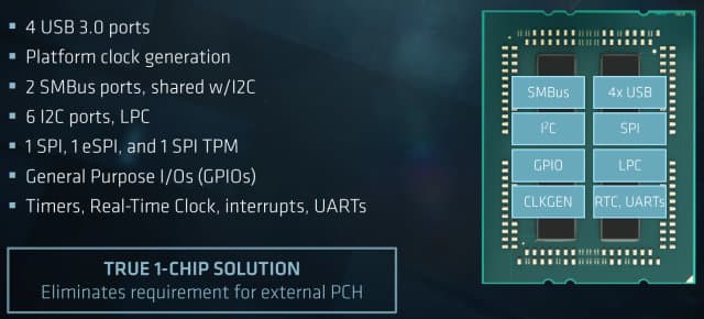 Еще одним важным преимуществом Epyc является то, что это не просто CPU, а целая однокристальная система (System-On-Chip, SoC). Кроме вычислительных ядер и контроллеров памяти, каждый чип Epyc включает и различные контроллеры: четыре порта USB 3.0, генератор частот, два порта SMBus, шесть I2C, таймеры, прерывания и др. Встроенная чипсетная функциональность означает, что новые процессоры AMD могут обходиться без отдельного чипсета, устанавливаемого на системную плату — это даст возможность уплотнить их дизайн и удешевить конечные решения.