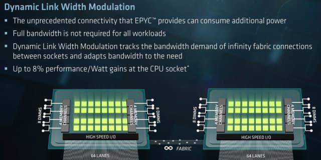 Питание линий ввода-вывода на процессорах серии Epyc 7000 также масштабируется с использованием динамического изменения ширины линий. Полная пропускная способность между сокетами нужна не всегда и соединения PCIe между сокетами могут динамически отключаться. Одна эта функция способна повысить общую энергоэффективность до 8% на процессорный разъем.