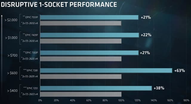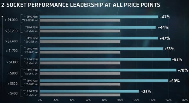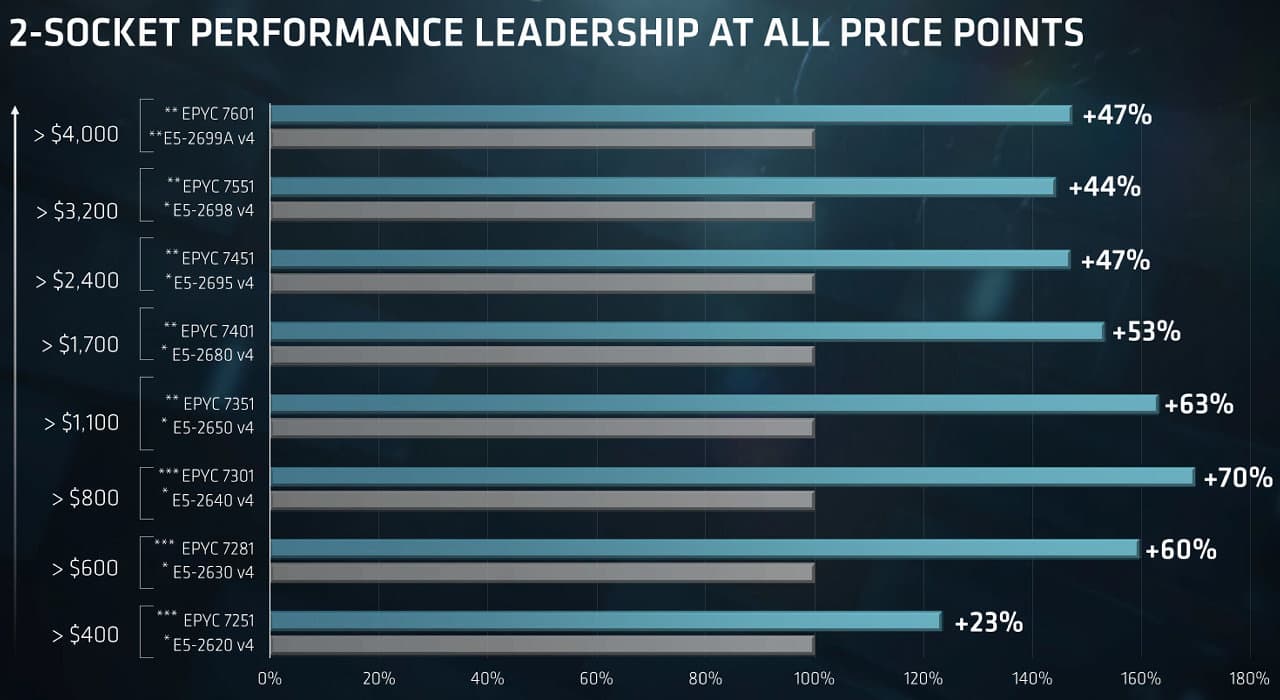 Посмотрим и на другие сравнения AMD, которые они показали публике. Если смотреть на различные ценовые сегменты, то серия Epyc 7000 смотрится на уровне систем на основе Xeon очень сильно. Во всех однопроцессорных и двухпроцессорных конфигурациях и ценовых сегментах от $475 до более чем $4000, компания AMD заявила о явном преимуществе в производительности у Epyc перед Xeon — превосходство варьируется от весомых 21% до невероятных 70%, с наибольшим успехом в самых популярных и массовых сегментах от $600 до $1100.
