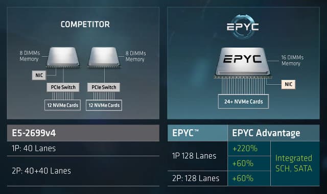 Каждый кристалл в Epyc имеет контроллер PCI Express 3.0, поддерживающий два x16 канала, которые можно разбить на необходимое количество менее скоростных (но не более восьми штук), но в двухпроцессорных системах один из них занят шиной Infinity Fabric, а в однопроцессорных все линии PCIe можно вывести для подключения периферии, и набор из каналов x4 или x2 будет полезен для подключения NVMe-накопителей.