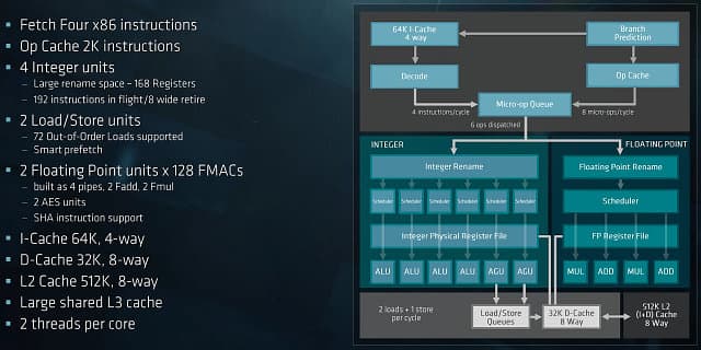 Но если вкратце, то Zen — это полностью новая микроархитектура, позволяющая выполнять четыре целочисленные инструкции за такт и имеющая поддержку многопоточности (исполнение на каждом физическом вычислительном ядре двух потоков) SMT, аналогичную технологии Intel Hyper-Threading.