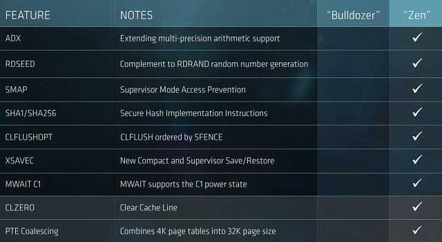 Микроархитектурные улучшения Zen (включая SenseMI, XFR, Neural Net Prediction, Pure Power, Precision Boost, изменения в кэшировании и т. п.) обеспечили более чем полуторакратный прирост по количеству выполняемых инструкций за такт, по сравнению с ядрами архитектуры предыдущего поколения Bulldozer, по данным компании AMD. Ядра Zen также куда более энергоэффективны и поддерживают дополнительные наборы инструкций.
