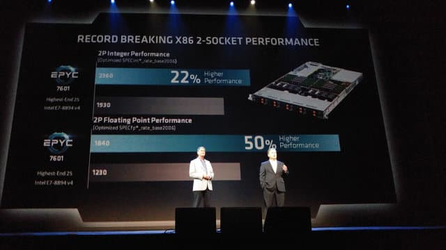 Компания Supermicro вообще проявила значительную активность и в выступлении на мероприятии AMD, представив свои решения и указав на явные преимущества нового CPU, по сравнению с Intel Xeon в виде рекордной производительности: