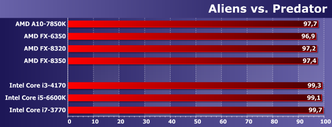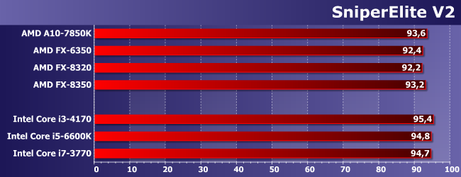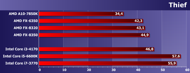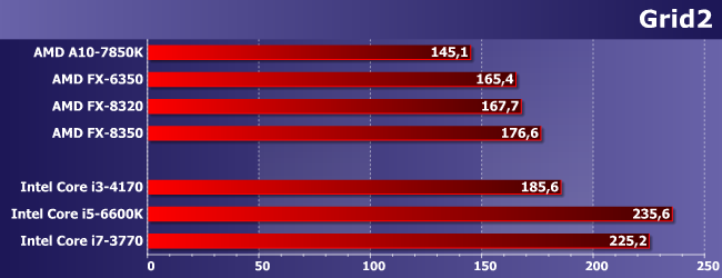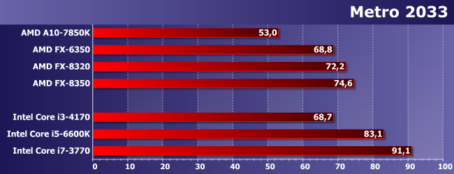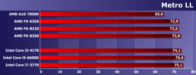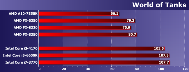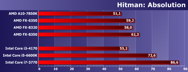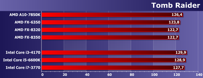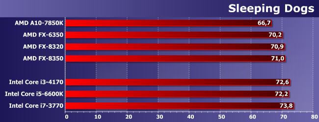 Наиболее интересно нам тут сравнение FX-6350 с FX-8320. Как и следовало ожидать, иногда первый оказывается быстрее — из-за частоты, дающей более высокую однопоточную производительность. Иногда же он немного отстает. Но немного; зато заметно опережает A10-7850K, который мы используем «в режиме» Athlon X4 860K. Причем отметим, что иногда обоим сегодняшним героям удается обогнать и Core i3-4170, т.е. игры, в которых недостаточно четырех потоков, встречаются. Но то, что нигде не удалось сравняться с Core i5 (за исключением случаев, когда любого процессора достаточно), даже там, где последние отстают от Core i7, хорошо показывает, что одного лишь количества потоков недостаточно. Что, впрочем, само по себе давно и хорошо известно.