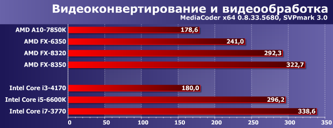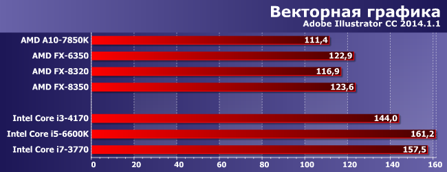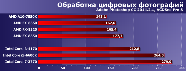 Бывает и хуже — во многом из-за Photoshop, многопоточная оптимизация в котором присутствует кое-где и кое-как. Так что гоняться за большим количеством ядер его пользователю не за чем. А это, кстати, опять играет в пользу трехмодульных процессоров, которые являются разумным компромиссом. Если, конечно, вообще ориентироваться на продукцию AMD — она вся небыстрая, а решениям для АМ3+ еще дискретная видеокарта требуется, так что проще уж Core i3 купить (и быстрее тоже).