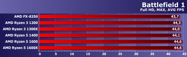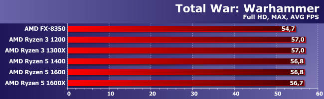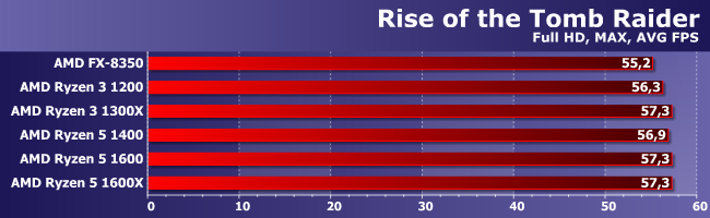 Наконец, в последней игре списка никто ни от кого не отстает: все Ryzen вообще одинаковые, а FX-8350 уступает им пренебрежимо мало. При этом во всех случаях мы лишь немного «не дотянули» до столь желанных многим 60 FPS, но в очередной раз винить в этом стоит в основном видеокарту — или слишком жесткие для нее настройки.