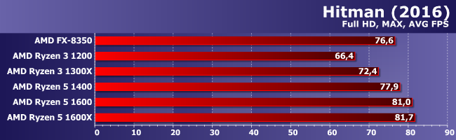 Hitman — мультиплатформенная игра, оказавшаяся одним из первых проектов, специально разрабатывавшихся под Xbox One и PlayStation 4. А что объединяет эти две консоли и отличает их от приставок предыдущего поколения? Использование специализированных APU AMD, содержащих в себе восемь х86-ядер, пусть и медленных. В итоге нет ничего удивительного в том, что и ПК-версии игры очень «нравится» поддержка восьми потоков вычислений, а вот больше ей как-то уже и не нужно. Впрочем, ядра Ryzen сами по себе быстрее, так что неплохую частоту кадров можно получить и на младших процессорах без SMT. Однако это единственная игра набора, где Ryzen 3 отстают от FX.