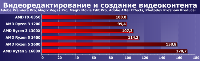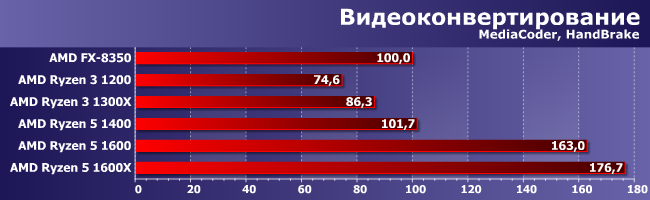 Как и следовало ожидать, в подобных задачах количество потоков вычислений критично: если младший Ryzen 5 (несмотря на более низкую частоту) хоть немного, но опережает FX-8350, то оба Ryzen 3 от последнего отстают. Впрочем, вся упомянутая четверка на фоне Ryzen 5 1600 просто теряется, так что если уж вам часто приходится (пере)кодировать видео, то выбирать, в общем-то, и не из чего. Шесть ядер в таком случае — не прихоть, а разумная необходимость, сейчас, стараниями AMD, сильно подешевевшая. Экономия тут не оправдана: слишком уж велика разница в производительности.