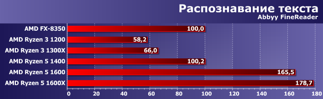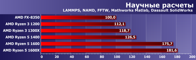 Старые целочисленные алгоритмы — область, где тот же FX-8350 «еще ого-го». Ryzen 3 же в таком окружении вновь выглядят слишком бледно. Ну а лучше всего — быть «здоровым и богатым»: понятно, что такие условия наиболее благоприятны для Ryzen 5 1600 и старших новых моделей.