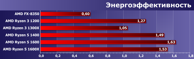 В итоге и получаем, что по отдаче на каждый ватт мощности лучшими оказываются шестиядерные Ryzen 5. Впрочем, и Ryzen 5 1400 тоже относительно неплох, чего нельзя сказать о Ryzen 3. Таким образом, «расплатой» за низкую цену этих процессоров будет не только пониженное абсолютное быстродействие, но и более низкая энергоэффективность. В общем, обмануть природу сложно. А производителей процессоров — еще сложнее :)