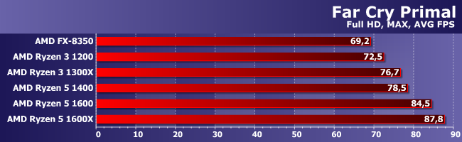 Еще один «хороший» для процессорных тестов случай. Впрочем, как многие помнят, игры линейки Far Cry лояльно относились к многоядерным процессорам и во времена, когда «двух ядер хватало всем» :) Здесь тоже лучше не слишком экономить и приобрести хотя бы Ryzen 5, однако даже старшие FX позволяют видеокарте «выдавать на гора» около 70 FPS (80 FPS, безусловно, лучше, но такая разница не слишком принципиальна).